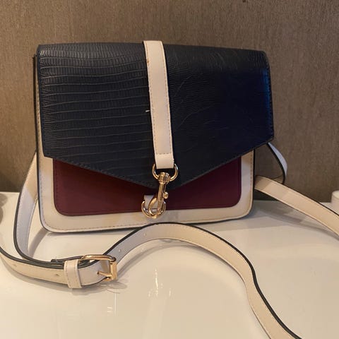 Kan brukes som skulderveske eller crossbody, kan også bæres som clutch. Fremstår som ny.