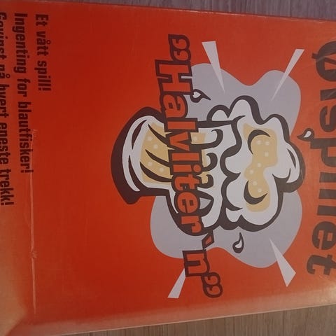 Ølspillet Halvliteren Brettspill. Spill for flere deltakere med fokus på ølrelaterte oppgaver og utfordringer. Inneholder spillebrett, kort, terninger og brikker. Passer til sosiale sammenkomster og spillkvelder.