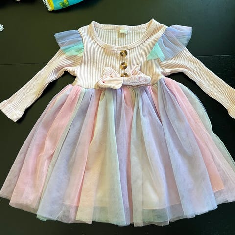 Reserved kjole for jente i størrelse 80 cm. Kjolen har et rutete mønster i myke farger og er laget av lett stoff. Den har lange ermer med elastiske mansjetter og en rund hals med små volanger. Passer for små jenter og egner seg til hverdagsbruk.