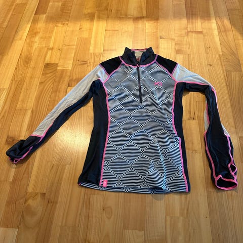 Bjørn Dæhlie langermet treningsgenser for dame i størrelse Small. Genseren har fargene rød, svart og hvit, og er laget av 64% bomull og 36% polyester i hovedmaterialet, med en innsats av 92% polyester og 8% elastan. Den har glidelås i halsen og er egnet for trening og utendørsaktiviteter.