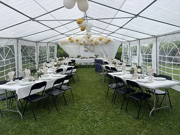 Utleie av partytelt, bord, stoler, høyttalere og arrangementutstyr til bryllup, konfirmasjon, bursdag og fest.