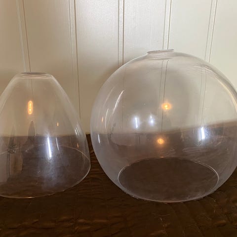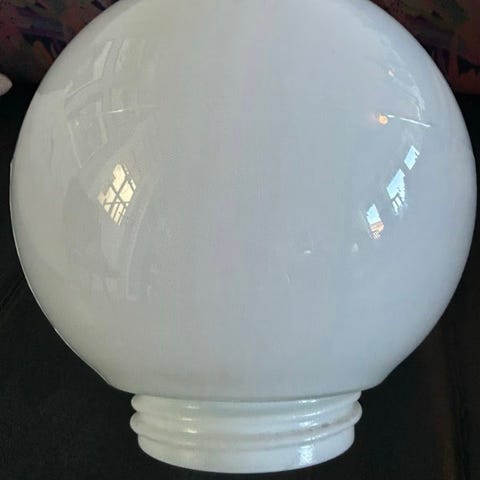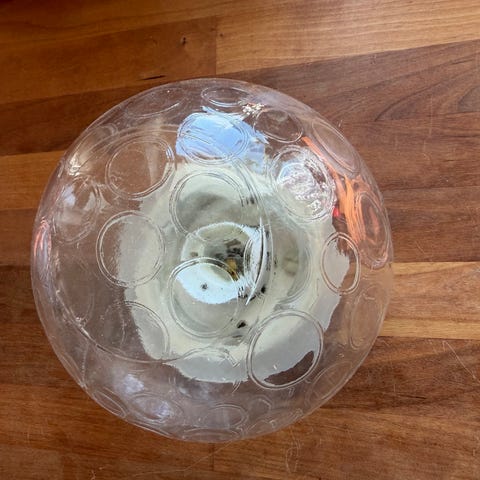 Svakt gyllen tone i glasset. 16 cm i diameter, åpning er 4 cm. Passer til lampe med liten sokkel og bajonettpære.. kan sende med postnord kr 69.