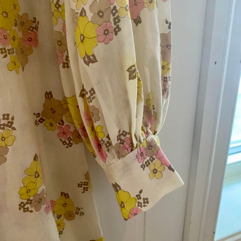 Vintagekjole med blondedetaljer og volanger selges. Størrelse 40, tilsvarer en M. 100% bomull, god å ha på. Litt misfarget under ene ermen, samt lite hull bak på siste bilde, men synes knapt. En kjole som ikke mange har! 🥹🤍