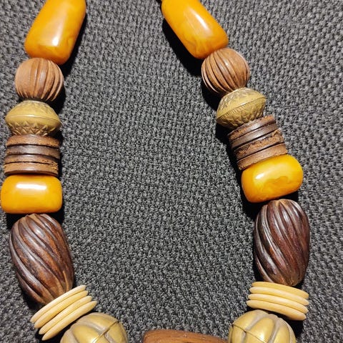 Vintage Gerda Lynggaard halssmykke av bein, lær og tre selges til sterkt redusert pris. Total lengde 74 cm