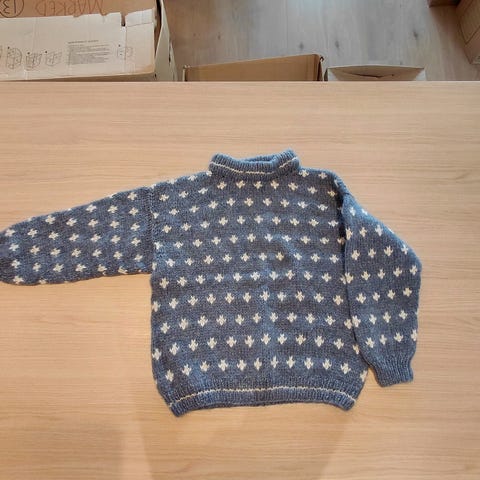 Hjemmestrikket genser av ullgarn. Kan passe til barn / ungdom ca 12 år. Se mål på fotografiene.