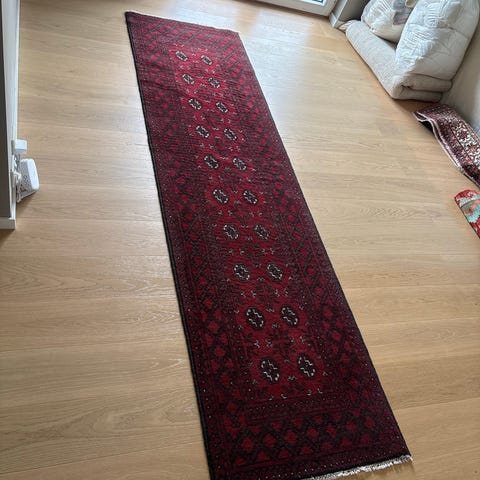 Håndlaget løper teppe med målene 84X176 cm. Fargene er hovedsakelig rød og svart med mønsterdetaljer. Teppet har frynser i endene og egner seg til bruk i gang eller smale rom.