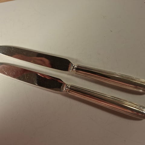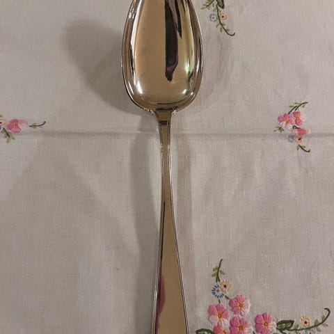 Det er en flekk på skjeen se siste bildet, tror sølvbelegget er slitt av. Ellers hele og fine med normale bruksmerker Trenger en puss