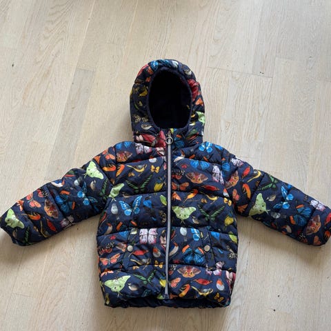 Lindex vinterjakke i størrelse 122, unisex. Jakken har blå farge med mønster og er designet for barn. Den har glidelås og trykknapper, samt lommer foran. Jakken er egnet for vinter og gir god beskyttelse mot værforhold.