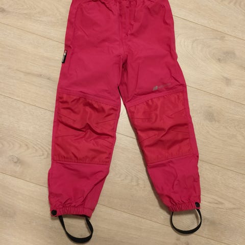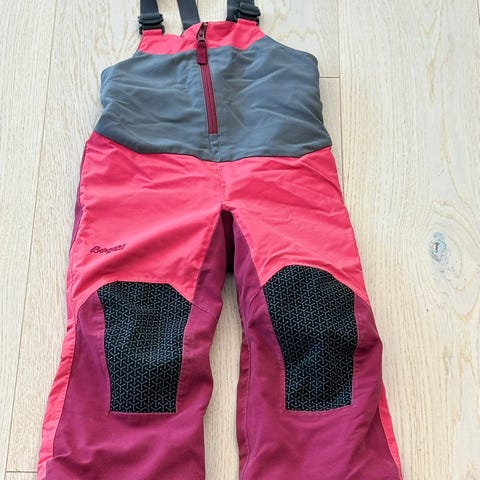 Bergans barnebukse i størrelse 92 for jente. Buksen er rød og laget av 100 % polyester med 3 % elastan (spandex) i yttermaterialet for fleksibilitet. Den har forsterkede områder på knærne med mønster for ekstra slitestyrke. Buksen har elastisk midje og refleksdetaljer på bena for økt synlighet. Godt brukt, men holdt seg veldig pen. Kommet et lite hull bak på høyre legg (se bilde).