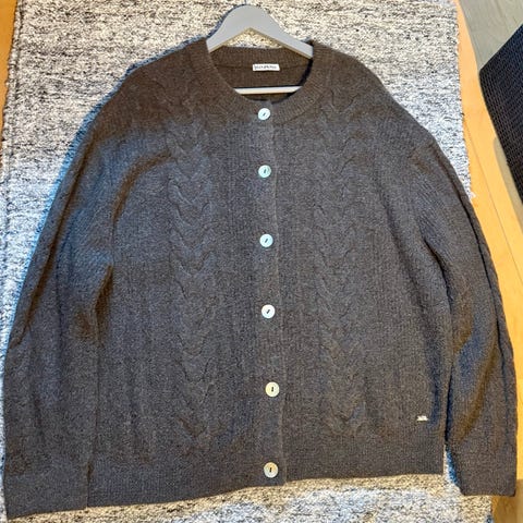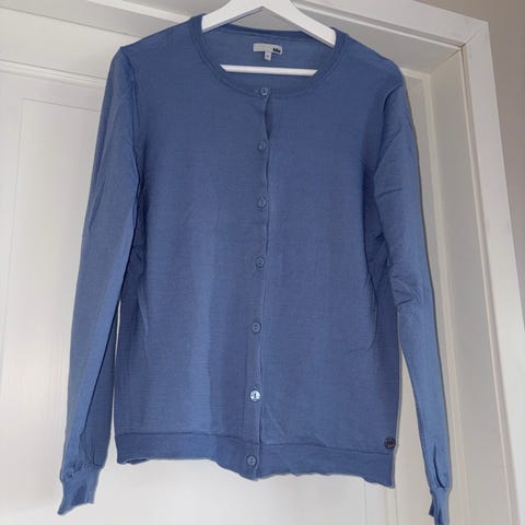 Jean Paul Cardigan i blå farge, størrelse XL. Laget av 80% ull og 20% nylon. Passer for kvinner. Designet for komfort med knappelukking foran.Varm og lang jakke