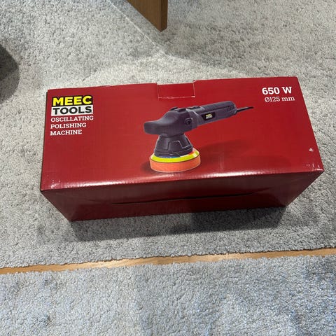 Draper poleringsmaskin med 230 V spenning og 100 W effekt. Maskinen er blå og har en poleringspute i hvitt materiale. Egnet for polering av ulike overflater.