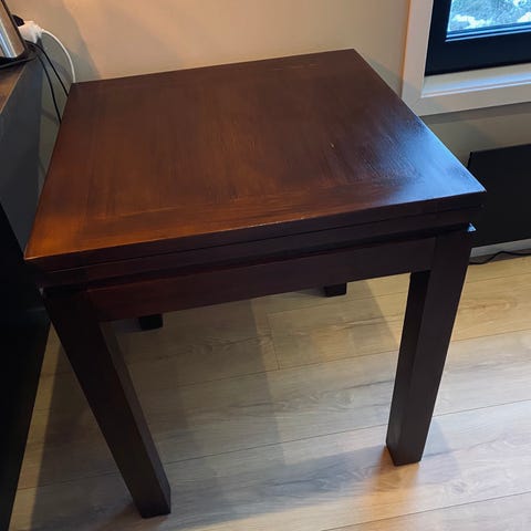 Dette fine rustikke salongbordet i mørkt treverk har tydelige bruksmerker på bordplaten, men om det slipes og lakkeres vil dette bordet kunne fortsette å gi glede i mange år! Bordet er 108 cm bredt, midtpartiet måler 55cm og klaffene er på 35cm, slik at med begge klaffen oppslått vil bordet være 125 cm langt. Høyden er 55cm.