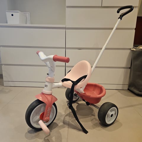 Smoby Tricycle Barn Trike med skyvestang, sikkerhetsbøyle, og pedaler. Sykkelen har blått sete, grønn ramme, og hvite håndtak med grønt grep. Designet for små barn med støtte for foreldre som kan styre ved hjelp av skyvestangen bak.