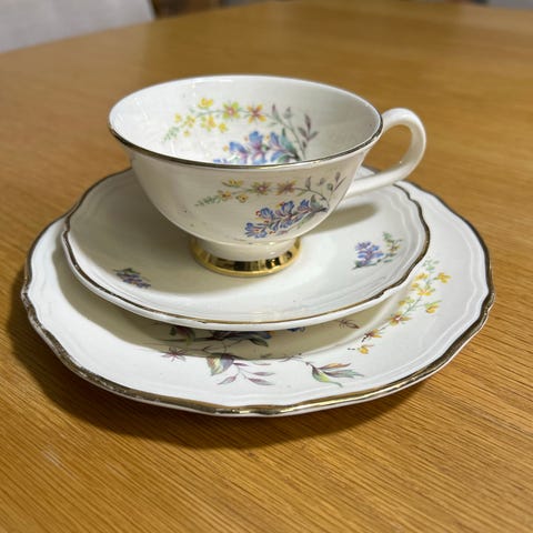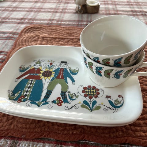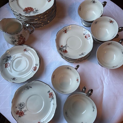 Helt og pent kaffeservise for 10 personer, totalt 30 deler. Serviset består av 10 håndmalte kopper, tefat og asjetter i porselen med dekorative rosemønstre i oransje og grå toner. Grønt PP-anker stempel og håndmalt 221/1 på undersiden. Vakkert med bølgete kanter og gullkantdetaljer. Har 2 asjetter og 1 tefat ekstra, som kan følge med i prisen.