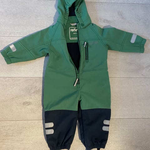 Reflex barne dress i blå farge, størrelse 80, designet for gutt. Dressen har elastiske mansjetter på armer og ben, glidelås med beskyttende klaff foran, og er laget av materiale som gir beskyttelse mot vær og vind.