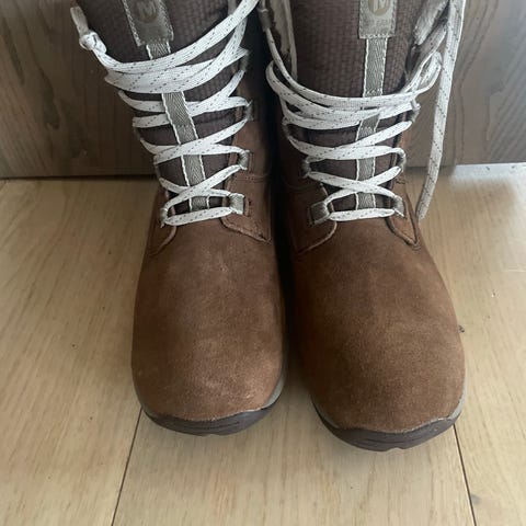 Merrell støvler i størrelse 39, brun farge. Laget av semsket skinn med gummisåler. Gode og varme vintersko.