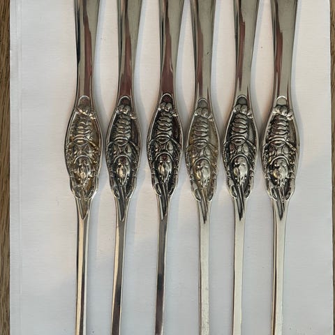 Seks hummergaffler fra Th. Marthinsen. 20 cm lang. Nypris nå er kr 586,- stk. Hentes på Bislett, sender ikke.