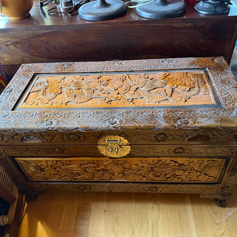Selger kiste med bla elg motiv. Denne er laget av treverk, men motivene er preget i en tynn metall plate. Litt usikker på hvilket metall.