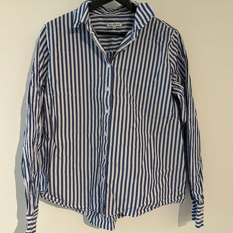 Bik Bok skjorte i størrelse L for kvinner. Skjorten har blå og hvite striper, langermet design med knappelukking foran og mansjetter. Laget i lett materiale egnet for daglig bruk.100 % bomull.