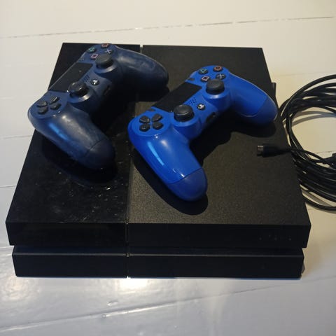 Sony Playstation 4 slim spillkonsoll i svart med tilhørende DualShock 4 kontroller i mørk blå farge. Konsollen har standard størrelse og design. Inkluderer ladestasjon for kontroller.