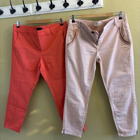 Materialet er 97 % bomull og 3 % elastan, så de har litt ettergivenhet og strekker seg litt. De har en knapp foran og glidelåsgylf.