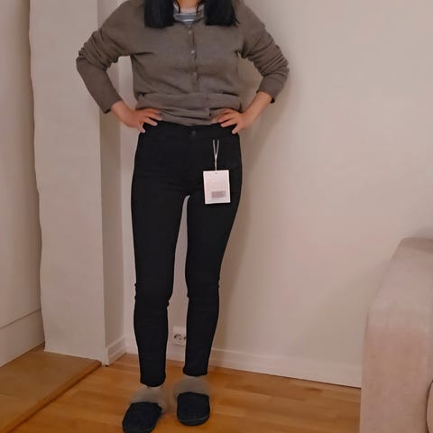 De har en knapp-og-glidelåsgylf og er laget av 58 % bomull, mens resten er tencel, polyester og lycra, så de har litt stretch i stoffet.
