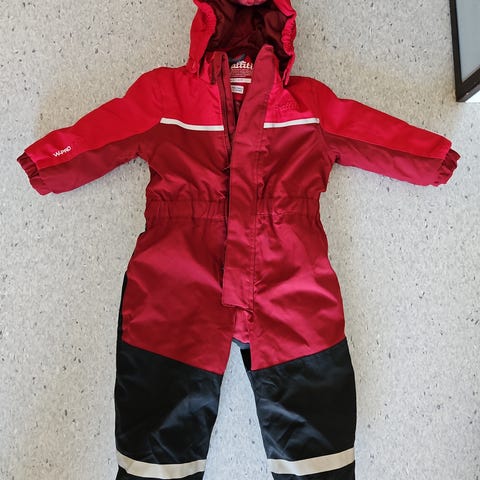 Polarn O. Pyret vinterdress for barn i størrelse 74. Dressen er rød og designet for unisex bruk. Den har hette, dobbel glidelås foran og elastiske stropper ved føttene for bedre passform og feste. Egnet for bruk i kalde værforhold.