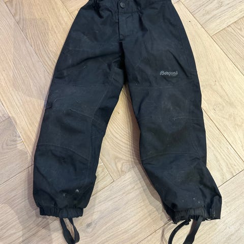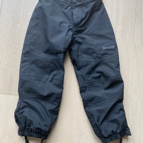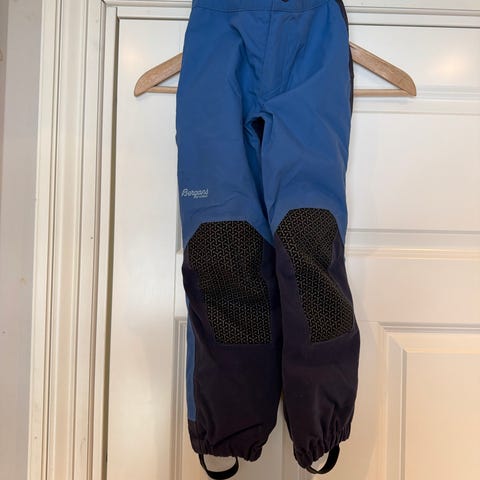 Ubrukt Bergans barnebukse i blå farge, størrelse 104, unisex. Laget med forsterkede partier på knær og sete for økt slitestyrke. Buksen har elastiske mansjetter nederst på bena og knapp- og glidelåslukking i front. Egnet for utendørs bruk.