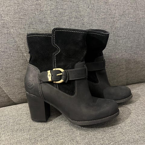 Tommy Hilfiger støvler i størrelse 38 for damer. Støvlene er laget av sort semsket skinn og har en dekorativ spenne i beige. Sålene har godt mønster for grep, og støvlene har en middels høy hæl.