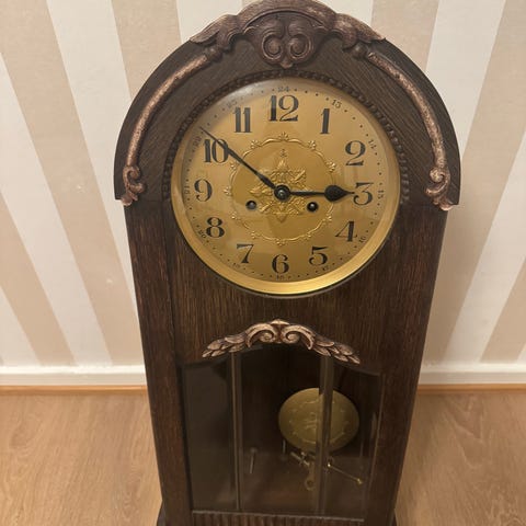 Veggur laget av tre med utskårne detaljer, glassdør og pendel. Klokke med rund urskive og tydelige tall. Passer til veggmontering og har et klassisk design.
