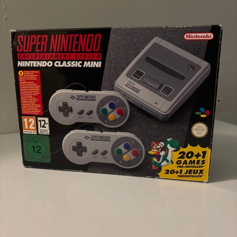 Nintendo Classic Mini Super Nintendo spillkonsoll med innebygde over 20 spill. Konsollen har to kontroller og er designet for å gi en klassisk spillopplevelse. Kompakt størrelse og grå farge.