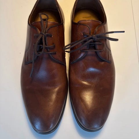 H&M pensko i størrelse 40. Skoene er laget av brunt skinn og har snøring. Egnet for formelle anledninger eller arbeid der pen sko kreves. Obs!: Venstre foten har en hvit merke