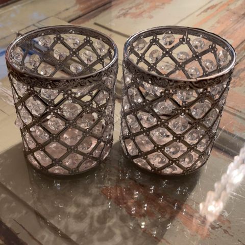 Sett med to dekorative lyslykter laget av metall med festede glasskrystaller.