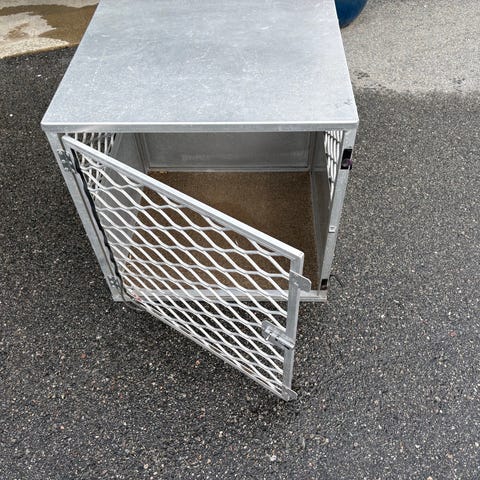 Solid hundebur i metall med målene 72 cm bredde, 69 cm høyde og 76 cm dybde. Buret er grått og har netting på dør og sider for ventilasjon. Er laget for sedan, men passer nok i stasjonsvogn også. Egnet for transport av hund størrelse 15 - 25 kg i bil.