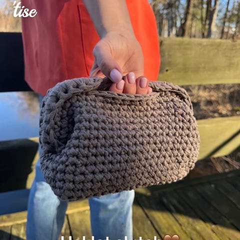 Håndlaget heklet clutch med håndtak i brun. Veskerammen er 22x9 cm🤎