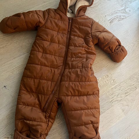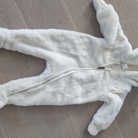 Zara unisex barnedress i størrelse 68. Dressen er laget av grå fleece materiale og har hette med øredetaljer. Den har knapper foran og to lommer. Innvendig fôr i lys farge med mønster.