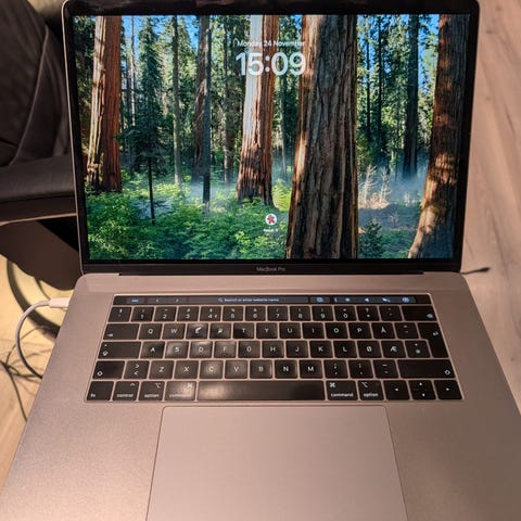 Selger en MacBook Pro 15" kjøpt ny januar 2019. Jeg er andre eier og har hatt den siden november 2022. Har stått ubrukt siste halvåret etter overgang til en annen maskin.