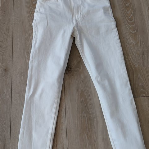 GANT jeans for kvinner i størrelse 34 med midjevidde W28. Jeansene er hvite og har detaljer som slitasjeeffekt på knærne. Materialet er ikke spesifisert, men pleieanvisninger er tilgjengelige på merkelappen.