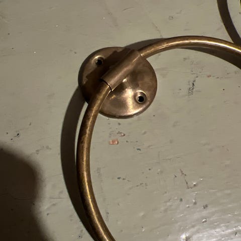 Toalettpapirholder, knaggrekke og håndklestang (60cm) i enkel, klassisk stil. Kjøpt nytt på bygningsvernbutikk. Skruer og plugger følger med