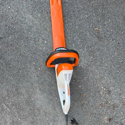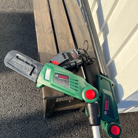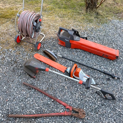 Begge hekksaksene er en del år, men fungerer veldig bra. Brukes ofte. Kantklipper er relativt ny og har vært lite i bruk. Gardena hekksaks er solgt.