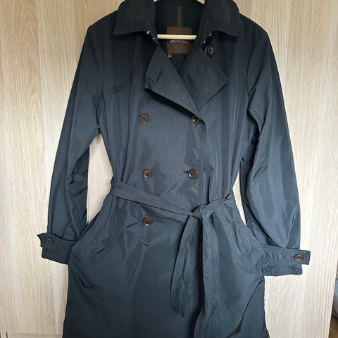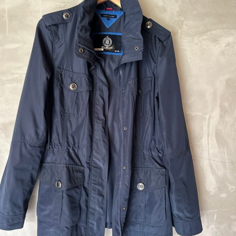 Tommy Hilfiger Annet yttertøy for kvinner i størrelse L.-Xl Jakken er blå og har en klassisk design med dobbelspent knappelukking og belte i midjen.