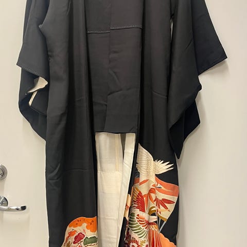 Svart og rød haori (kort kimono-jakke) i silke. Stoffet er delvis gjennomsiktig (se siste bilde). Står ikke størrelse, men estimerer at den er M. Jeg bruker vanligvis M-L og denne passer akkurat, men med litt glippe når jeg knyter den foran. Kjøpt i Japan, men jeg har flere og må rydde litt i samlingen.