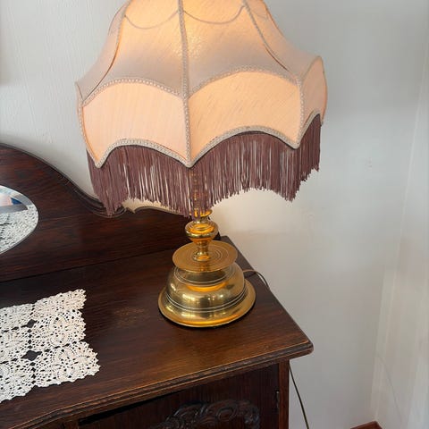Gulvlampe i smijern med dekorativt mønster og stoffskjerm i brune nyanser. Lampen har justerbar høyde og fot i smijern for stabilitet. Passer til bruk i stue eller soverom som en dekorativ lyskilde.