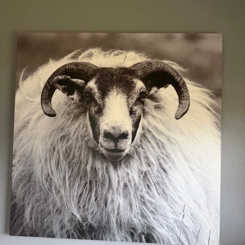 Dyrekranium med horn, brukt som dekorasjon. Kraniummet har naturlige sprekker og tekstur, med mørke horn festet på hver side. Passer til veggdekor eller samling av naturlige gjenstander.