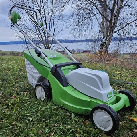 Viking HR 380 klippepanne med drivremmer og remskiver. Dekket viser tegn på slitasje og rust, men fungerer.