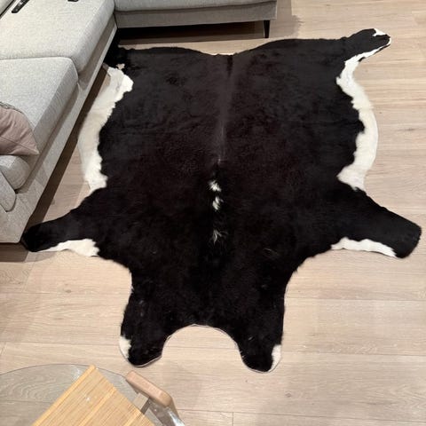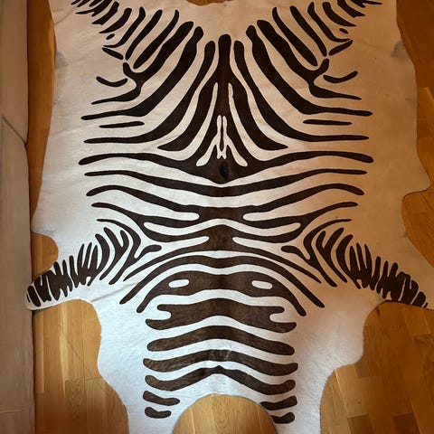 Zebra mønster teppe laget av kunstig skinn i fargene hvit og svart. Teppe har en uregelmessig form som etterligner dyrehud og egner seg til dekorasjon i hjemmet.