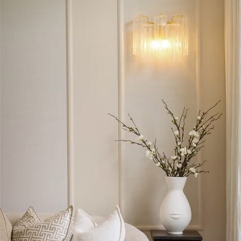 Ramme av messing med støpte Murano blader med relieffdekor. glass. Takkopp i glass og messing. Stang dekorert med omsluttende rør i glass.