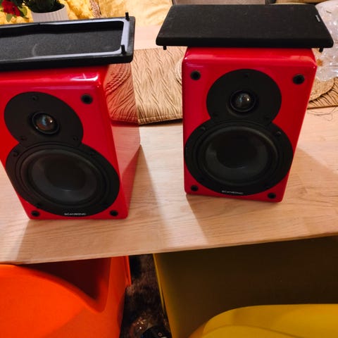 Høyttalere i hvit farge. Høyttaleren har en kompakt design med metallgitter foran på Canton høytalere og svart duk på deler av Scansonic S9 Passer til bruk i hjemmelydsystemer. Veldig bra høytalere .