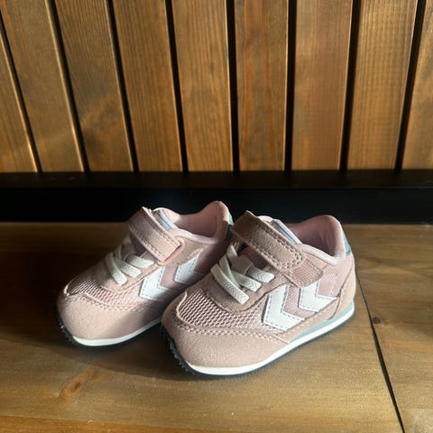 Hummel barne joggesko for jente i størrelse 19. Skoene er rosa med hvite detaljer og har borrelås for enkel justering og påkledning. Materialet er pustende og egnet for aktiv bruk.