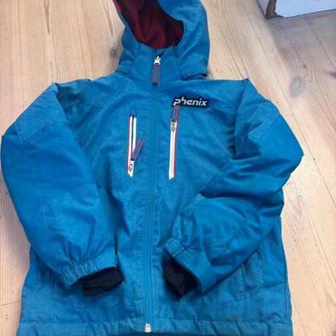 Phenix skijakke for barn i marineblå, rød og hvit farge. Jakken har hette og flere lommer med glidelås. Størrelse 4-8år.